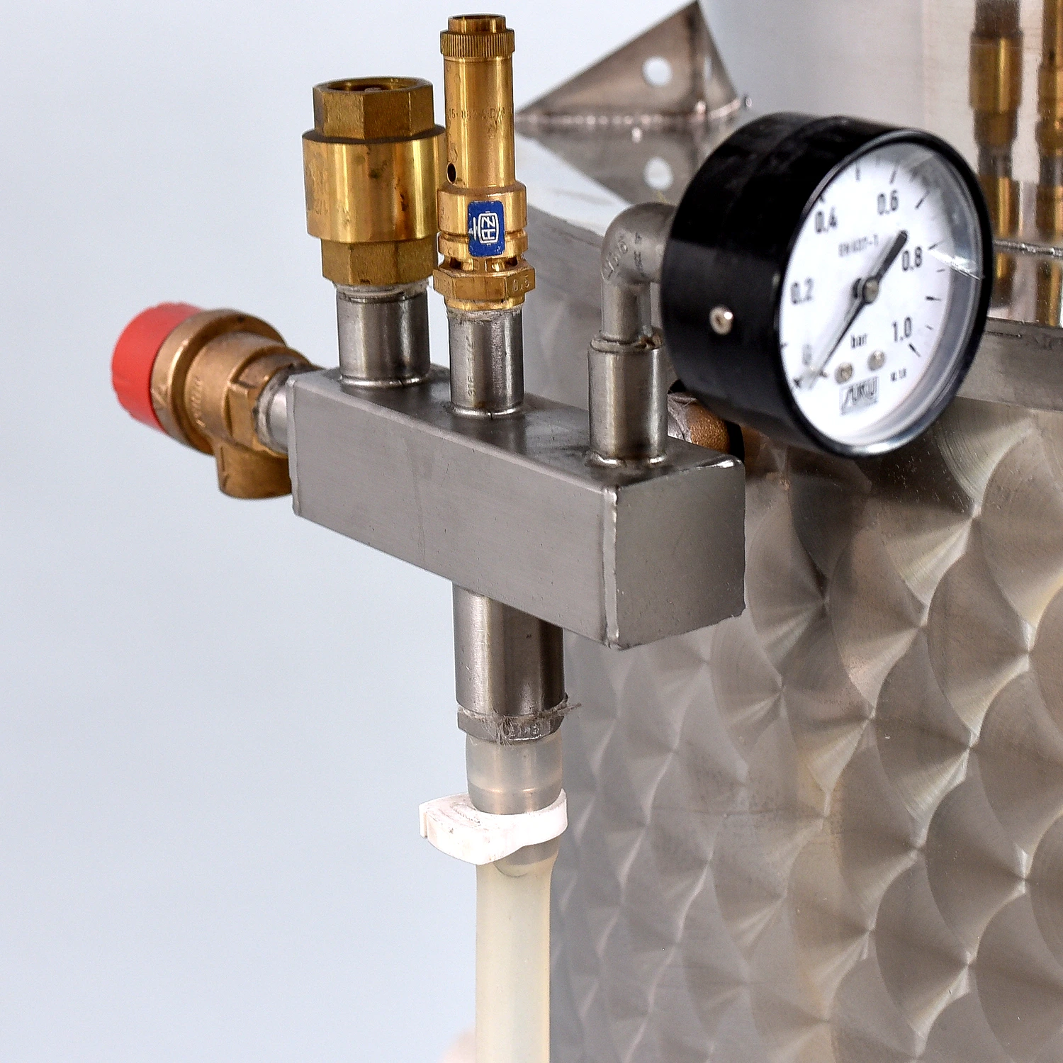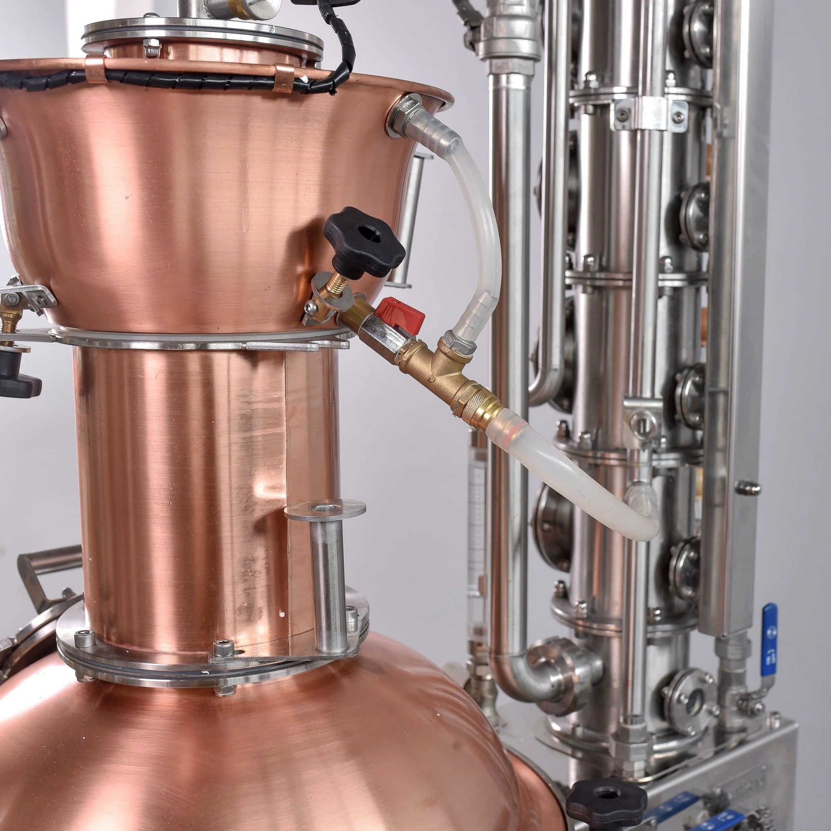A HERZ márkájú kézi egyenes szelepek szabályozzák a víz áramlását a véghűtőhöz, a Pistorius berendezéshez és a deflegmátorhoz.