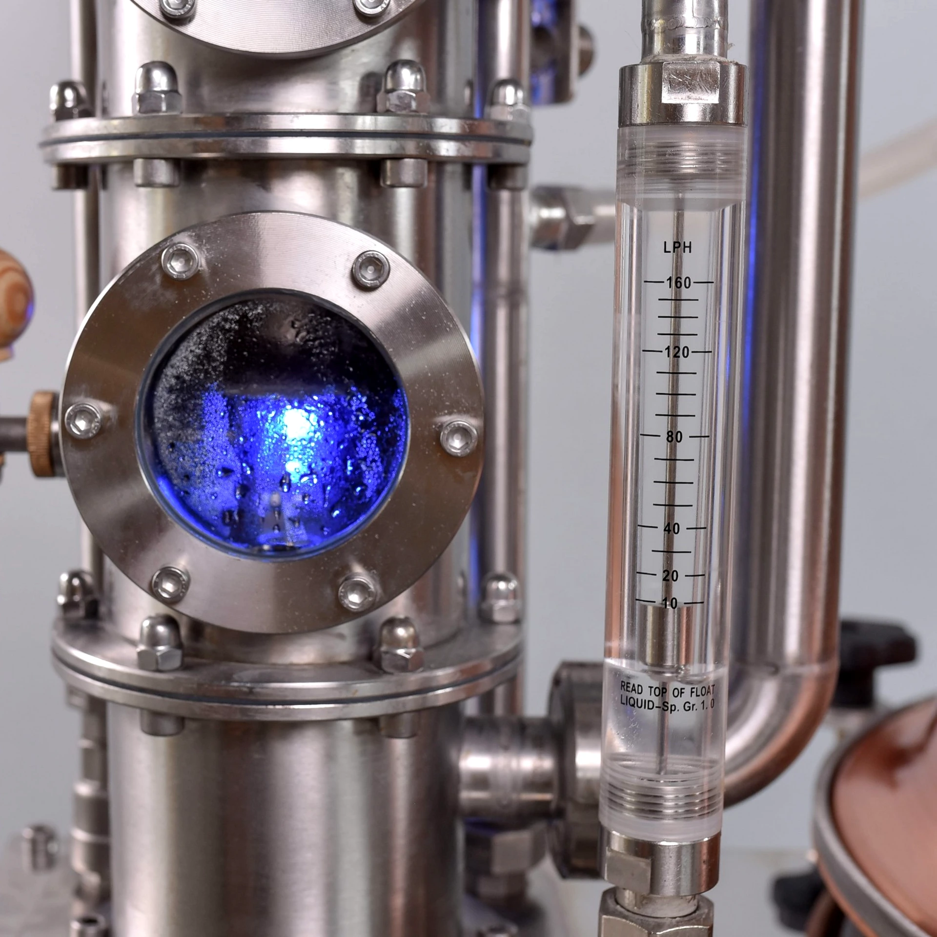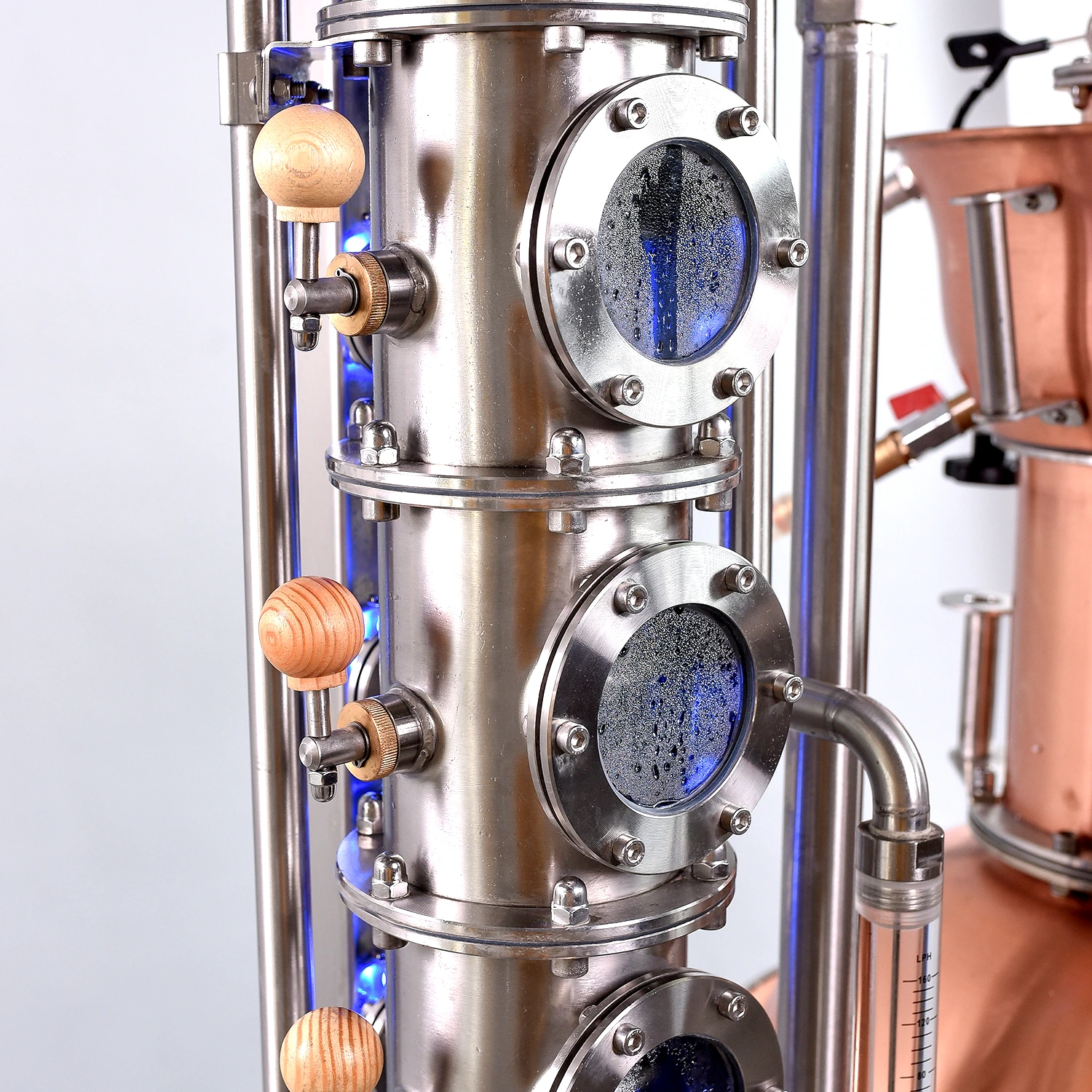 Funkciója: Az oszlopban zajló lepárlási folyamat helyes működése a nézőüvegeken keresztül látható, amennyiben az oszlop belső része megvilágított. Az oszlop hátsó felén 25 mm átmérőjű nézőüvegeken keresztül RGB LED világítja meg az oszlop belső terét. A bevilágítás nem csak esztétikai funkciót tölt be. Bevilágító fény nélkül nehezebb követni az oszlopban zajló lepárlási folyamatot.