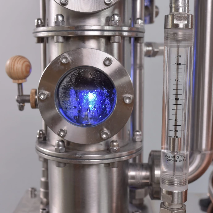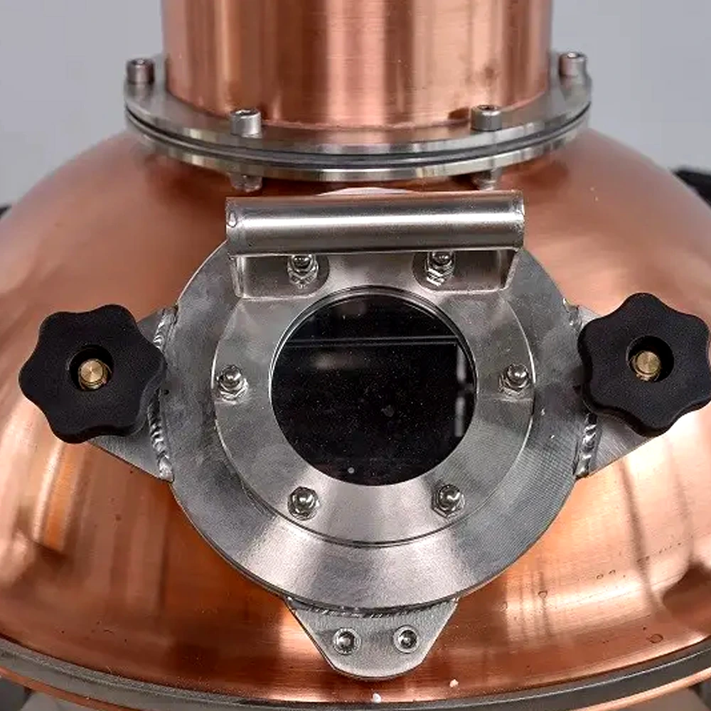 Peremezett nézőüvegek: 76 mm-es T idom- szerű kialakításuk higiénikus és esztétikus megoldás. A nézőüvegek nélkül lehetetlen a lepárlás érdemi követése és annak megfelelő szabályzása. Hőálló élelmiszeripari üveg és a profilhoz illeszkedő szilikon tömítés biztosítja a stabil zárást a karima kötéseken keresztül.