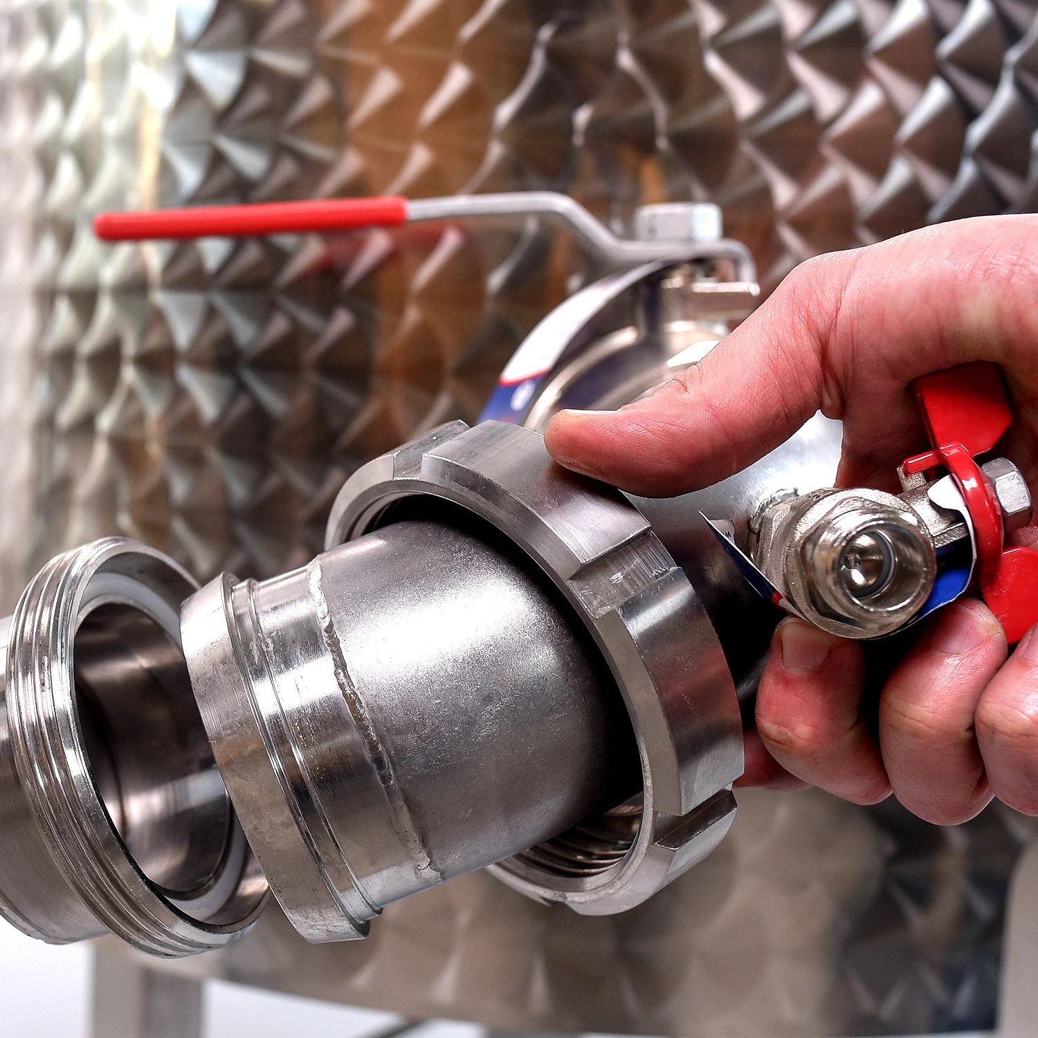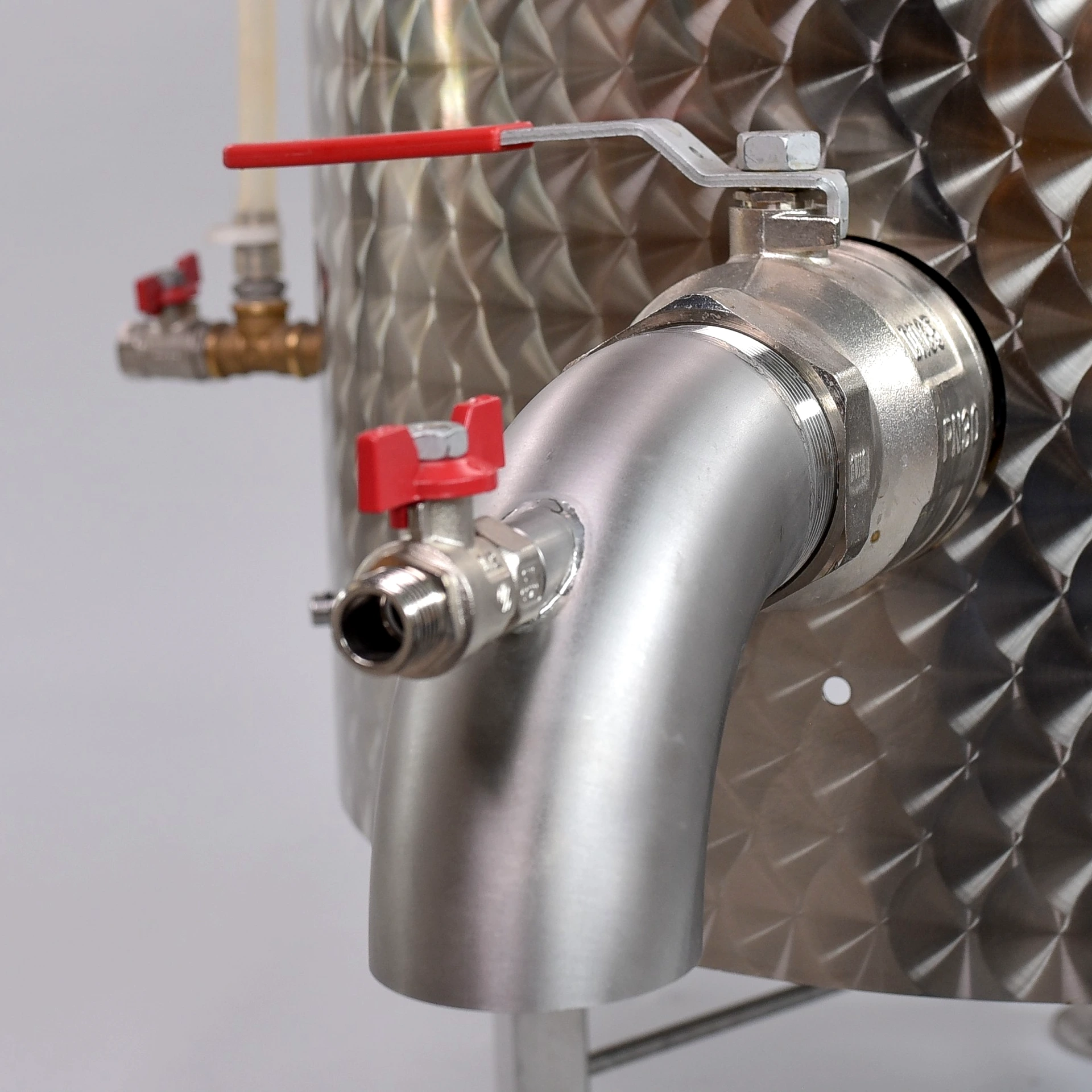 A 90 fokban elfordított kifolyó kiemelt biztonsági szerepet tölt be, mivel megakadályozza, hogy a forró cefre a golyóscsap megnyitásakor vízszintes sugárban kiáramoljon.