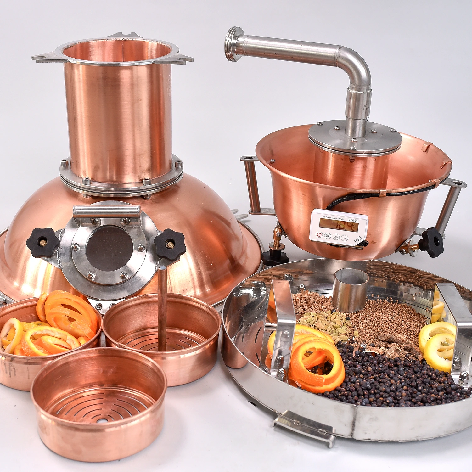Az üstben egy rozsdamentes acél (inox) aromakosár található, valamint a kupola felett további 3 darab réz aromakosár helyezkedik el. A gin, vodka vagy pálinka receptjétől függően különböző botanikák, fűszerek vagy aszalt gyümölcsök helyezhetők a kosarakba.