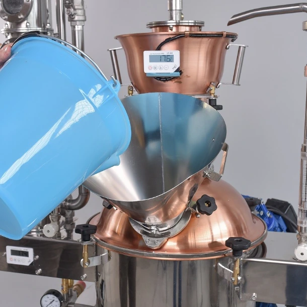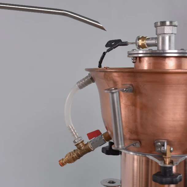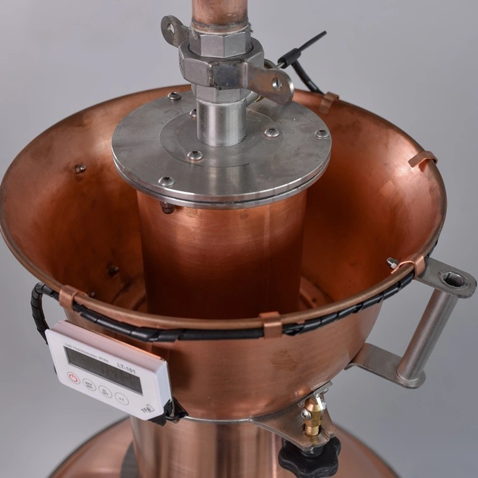 Ez az eszköz (alkoholmérő edény) lehetővé teszi a kifolyó párlat alkoholtartalmának folyamatos mérését a lepárlás során.