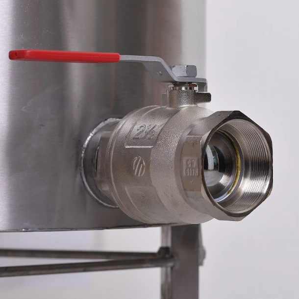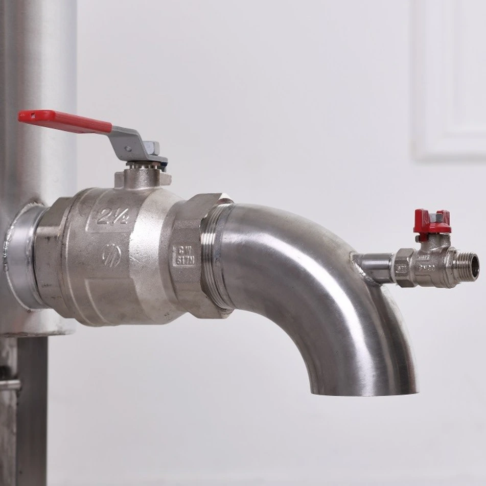 A 90 fokban elfordított kifolyó kiemelt biztonsági szerepet tölt be, mivel megakadályozza, hogy a forró cefre a golyóscsap megnyitásakor vízszintes sugárban kiáramoljon.