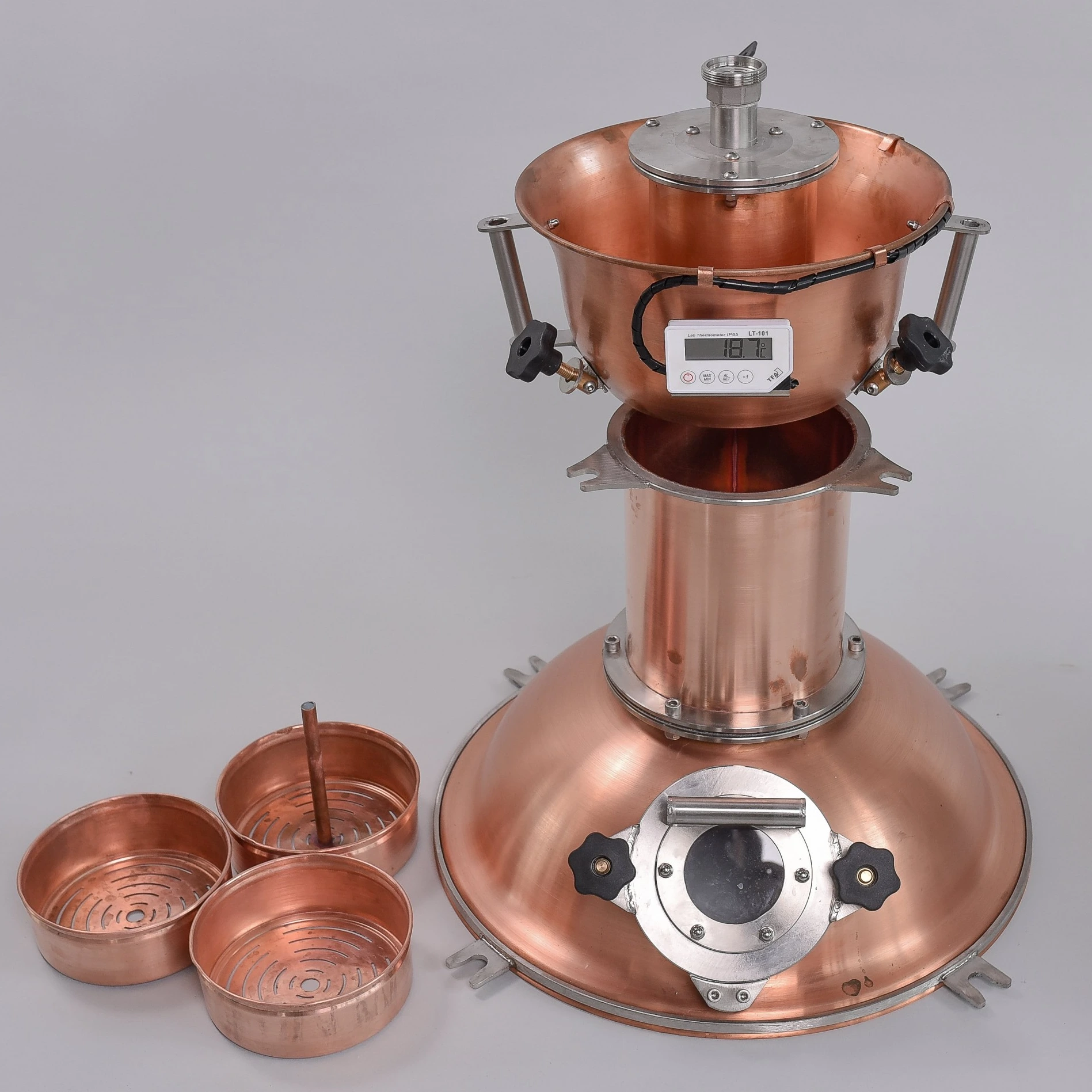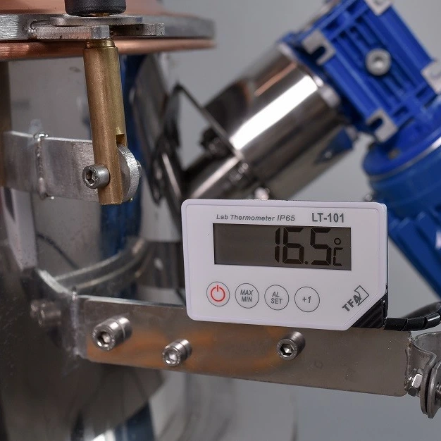 Tizedes pontosságú digitális hőmérőket alkalmazunk a cefre és a deflegmátor hőmérsékletének mérésére, mivel már a tizedfoknyi eltérés is jelentős hatással lehet a végtermék ízére. A hűtőn analóg hőmérő található, mivel a hűtővíz hőmérsékletét egy kb. 20 °C-os tartományon belül kell tartani.