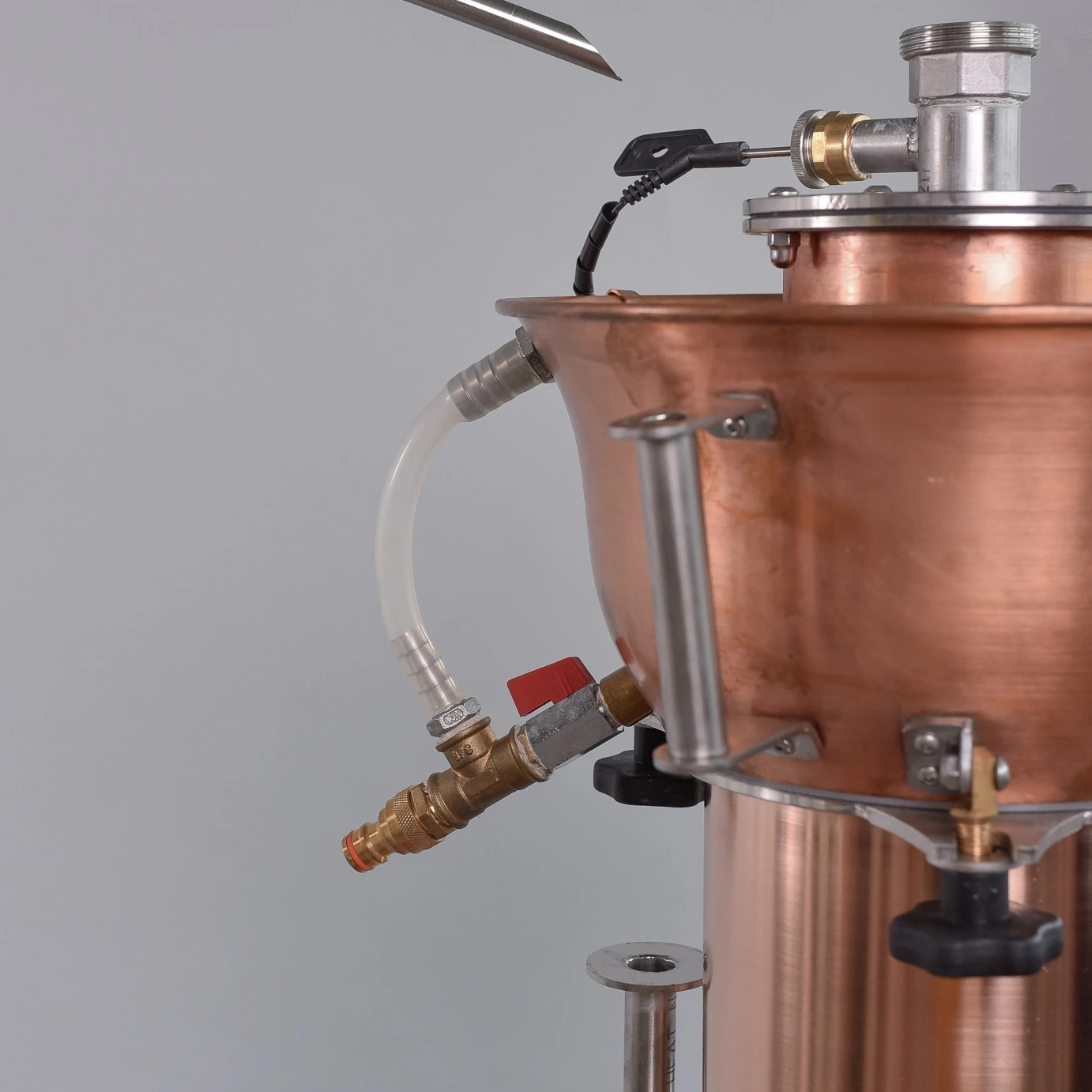 Az érzékelő közvetlenül a belső üst terébe nyúlik, így pontosan nyomon követhető a cefre hőmérsékletének emelkedése a felfűtési szakaszban, valamint a forráspont közeledése.